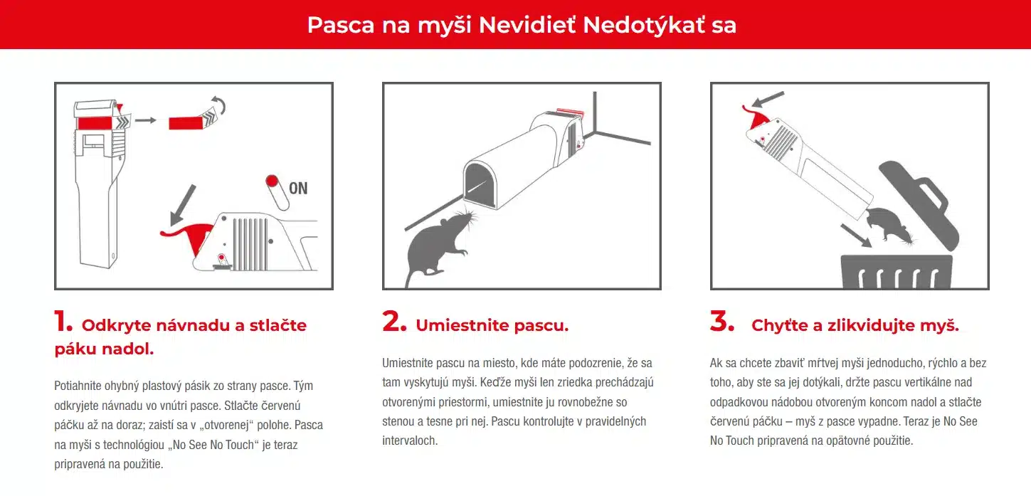 Použitie je jednoduché: pascu nastražíte stlačením páčky, umiestnite ju k stene alebo do rohu miestnosti a necháte pôsobiť. Po odchyte myši pascu držte nad košom a jediným stlačením páčky hygienicky vypustíte obsah.