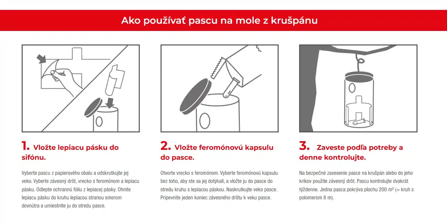Používanie je jednoduché – pascu stačí zavesiť priamo do krušpánového kríka. Feromónová kapsula je účinná až 3 mesiace a pokrýva plochu približne 200 m².